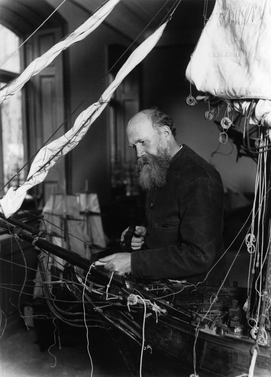Modellsnickare C G Nordström i Marinmuseums utställningslokaler på Strandvägen, Stockholm.