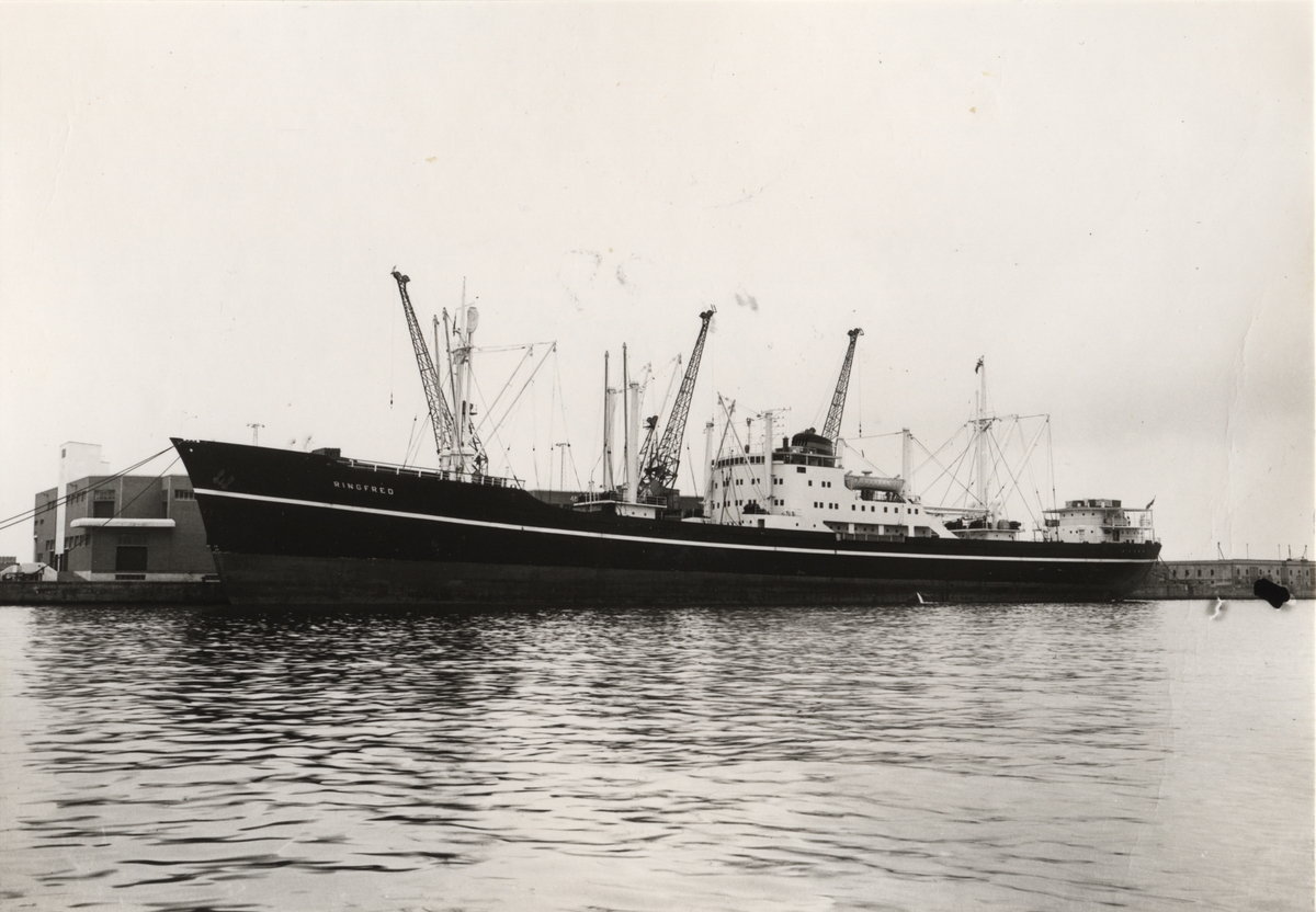 Titel: Foto i svartvitt visande lastmotorfartyget "RINGFRED" i Köpenhamn år 1956.