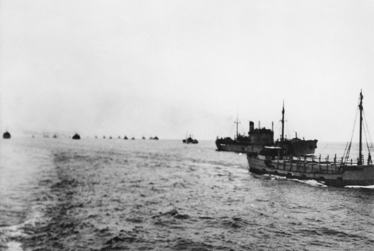 Titel: M/S Luleå i konvoj d 11 juli 1942. Klockan 1440-1505 före och efter dess torpedering utanför Idö, Västervik.