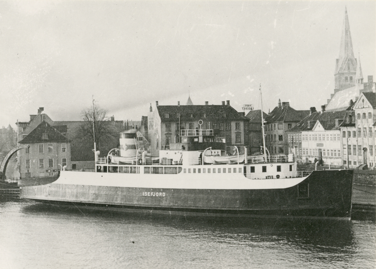 Foto i svartvitt visande bil & passagerarmotorfärjan Isefjord