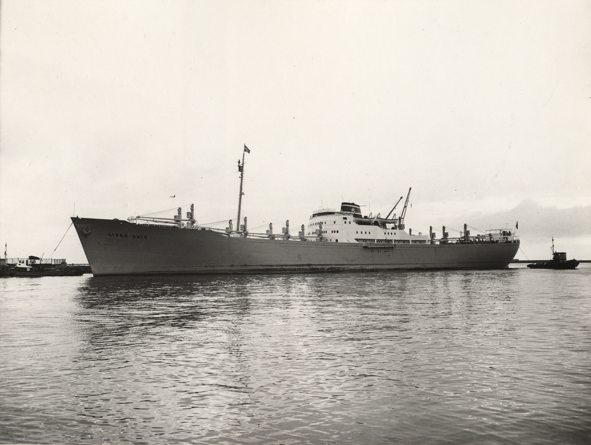 Foto i svartvitt visande lastmotorfartyget "LIONS GATE". Fotot taget i Köpenhamn maj månad 1959.