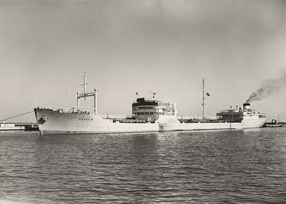 Foto i svartvitt visande malmtankmotorfartyget "HASSELÖ". Foto från Köpenhamn den 20.3.1959.