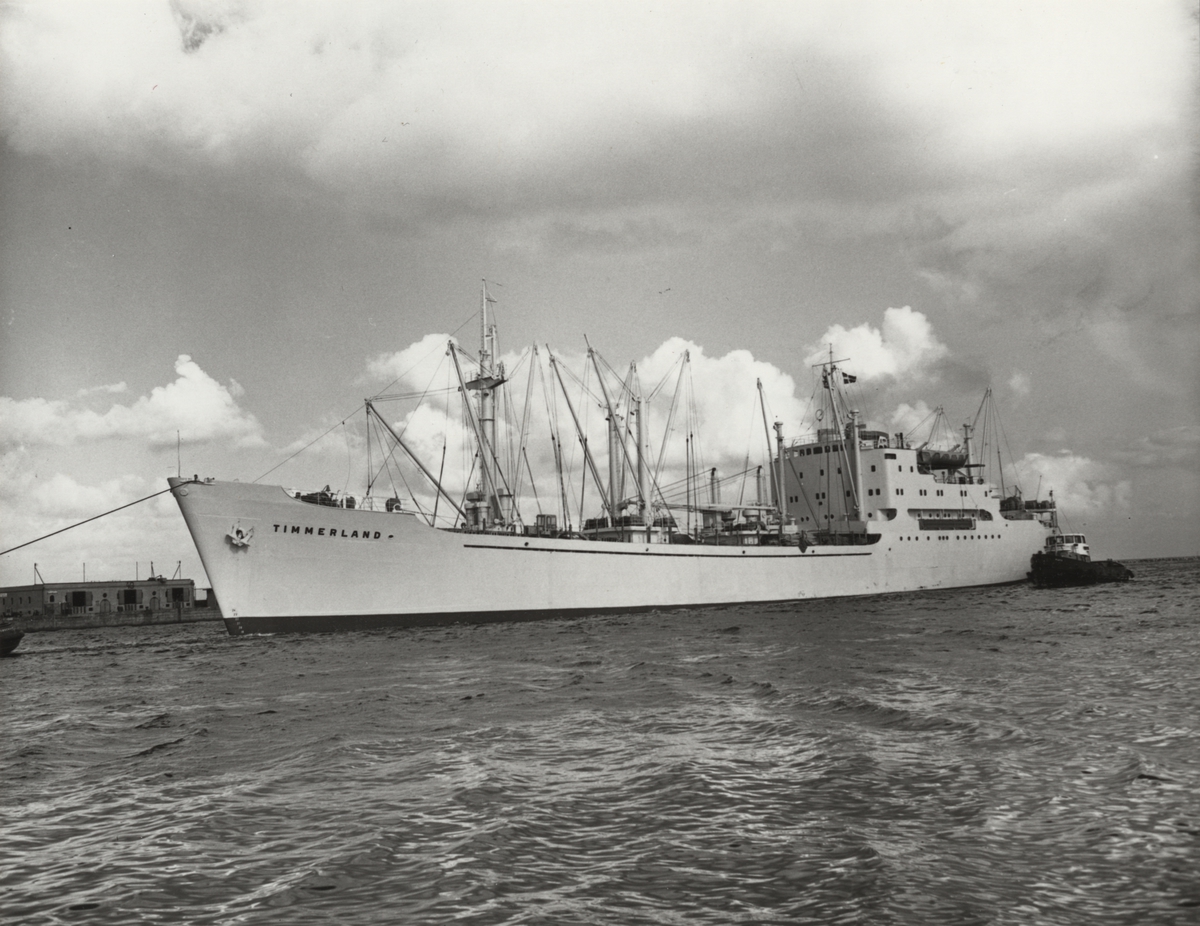 Foto i svartvitt visande lastmotorfartyget "TIMMERLAND". Fotot är taget i Köpenhamn sommaren 1959.