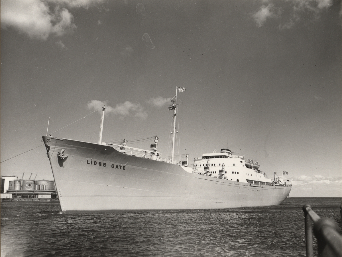 Foto i svartvitt visande lastmotorfartyget "LIONS GATE" taget i Köpenhamn april månad 1960.