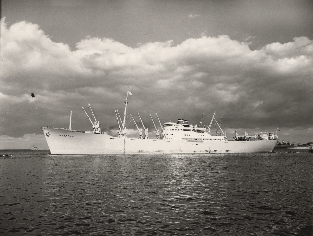 Foto i svartvitt visande lastmotorfartyget "SEATTLE" taget i Köpenhamn den 25.5.1960.