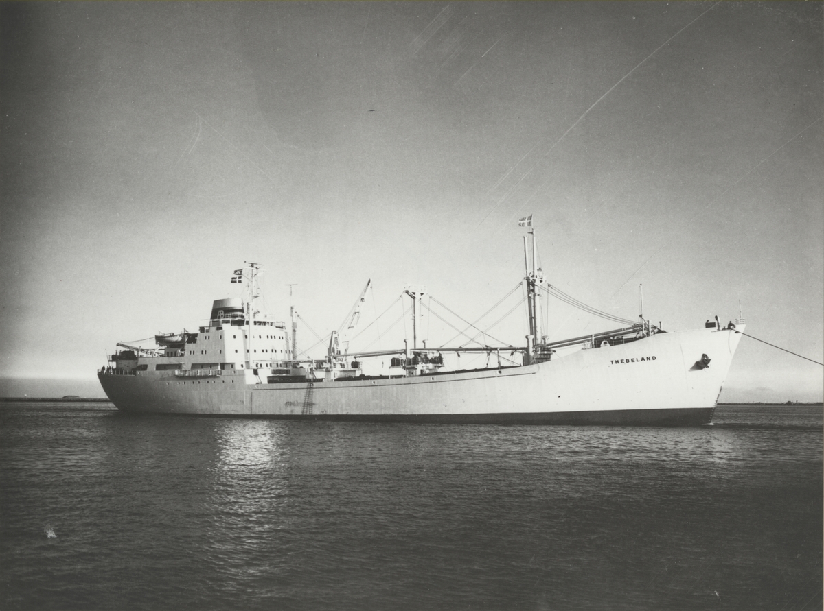 Foto i svartvitt visande lastmotorfartyget "THEBELAND" taget i Köpenhamn den 13.10.1962.