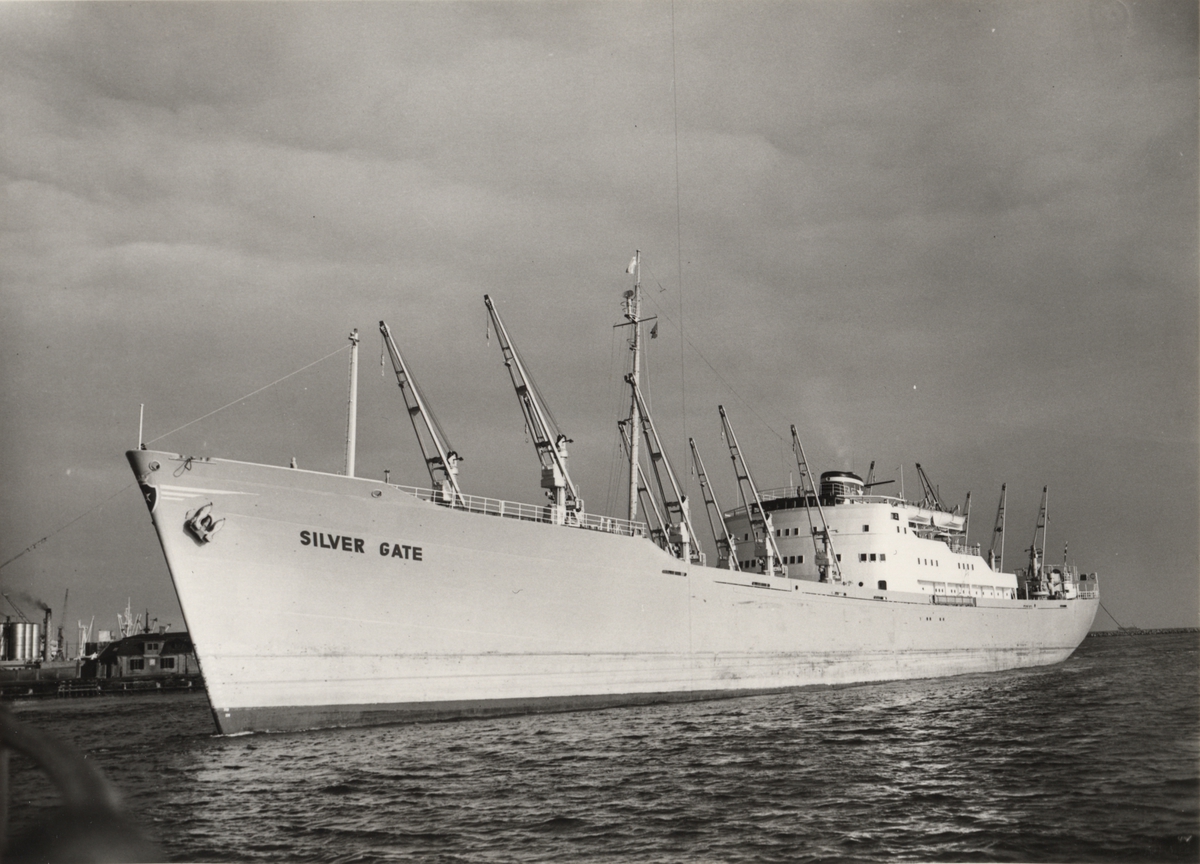 Foto i svartvitt visande lastmotorfartyget "SILVER GATE" taget i Köpenhamn någon gång under 1950-talet.
