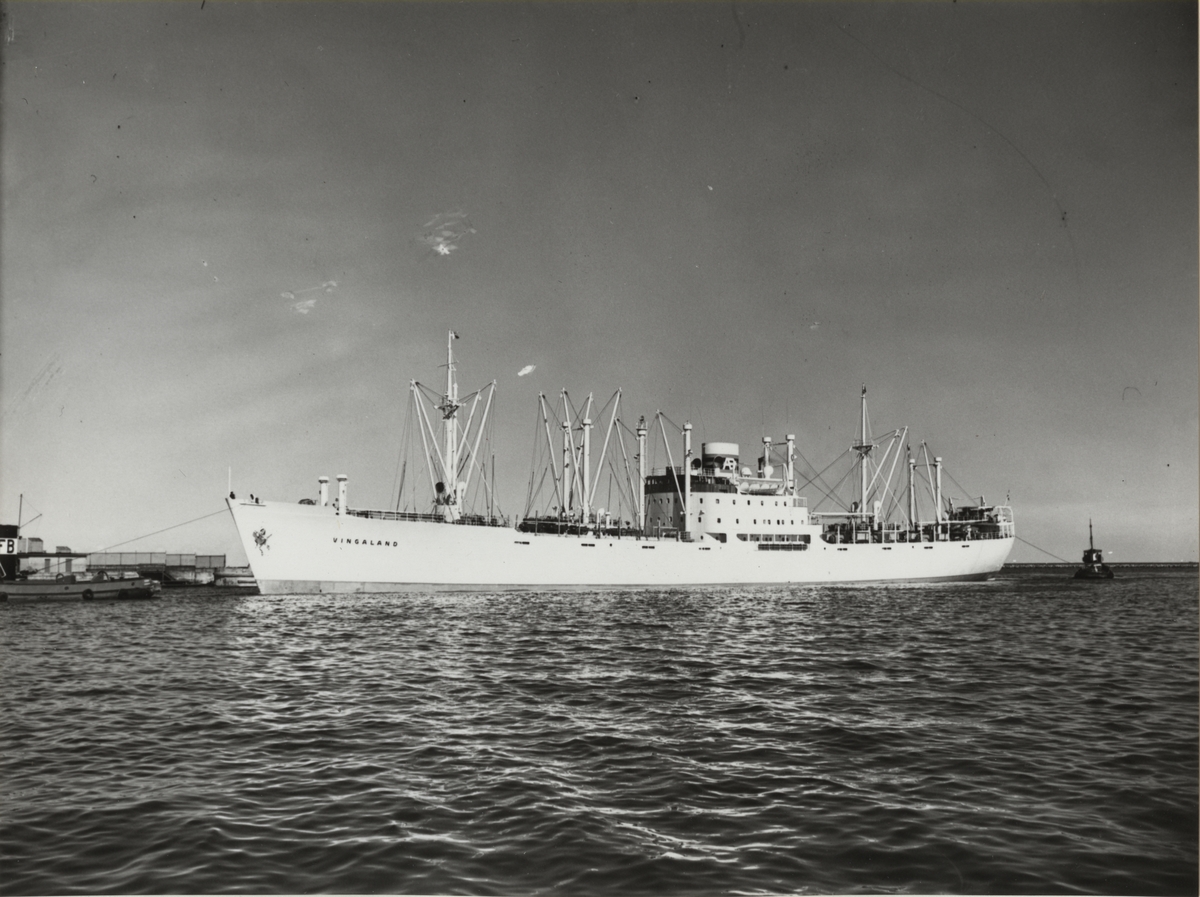 Foto i svartvitt visande lastmotorfartyget "VINGALAND" taget i Köpenhamn under september månad 1953.
