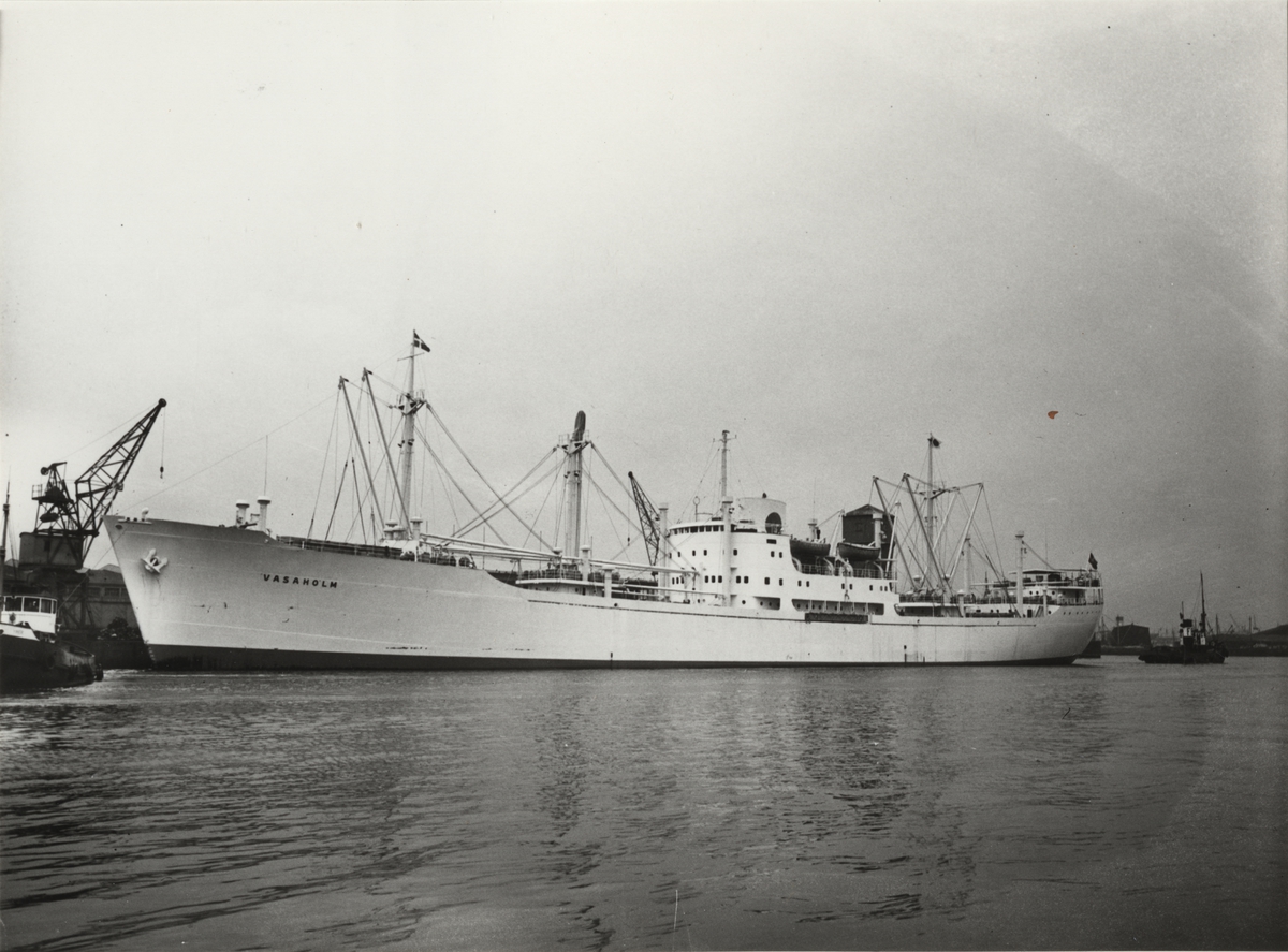 Titel: Foto i svartvitt visande lastmotorfartyget "VASAHOLM" taget i Köpenhamn någon gång under åren 1955 - 1962.