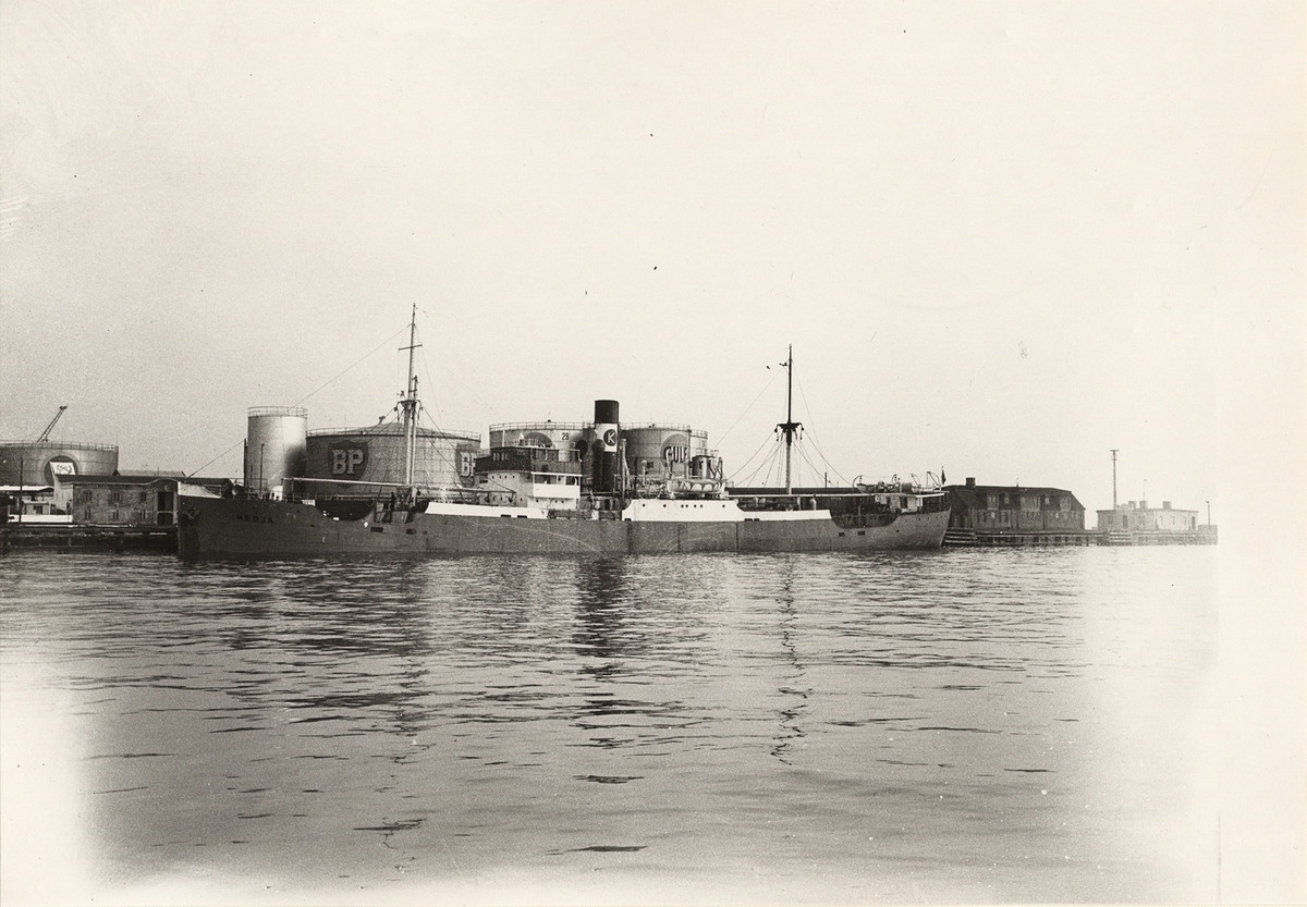 Foto i svartvitt visande lastångfartgyet "HEDJA" taget i Köpenhamn den 8.1.1955.
