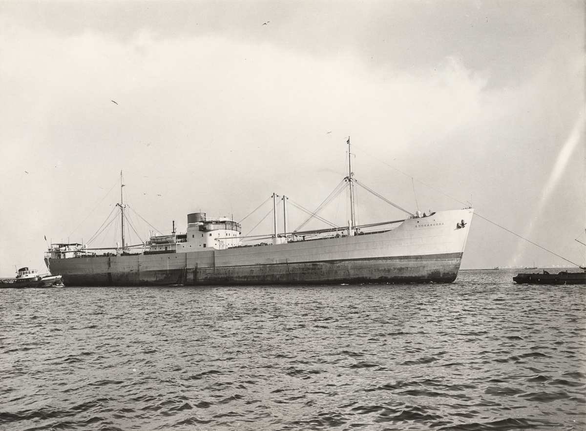 Foto i svartvitt visande lastmotorfartyget "KOOKABURRA" taget i Köpenhamn mars månad 1955.