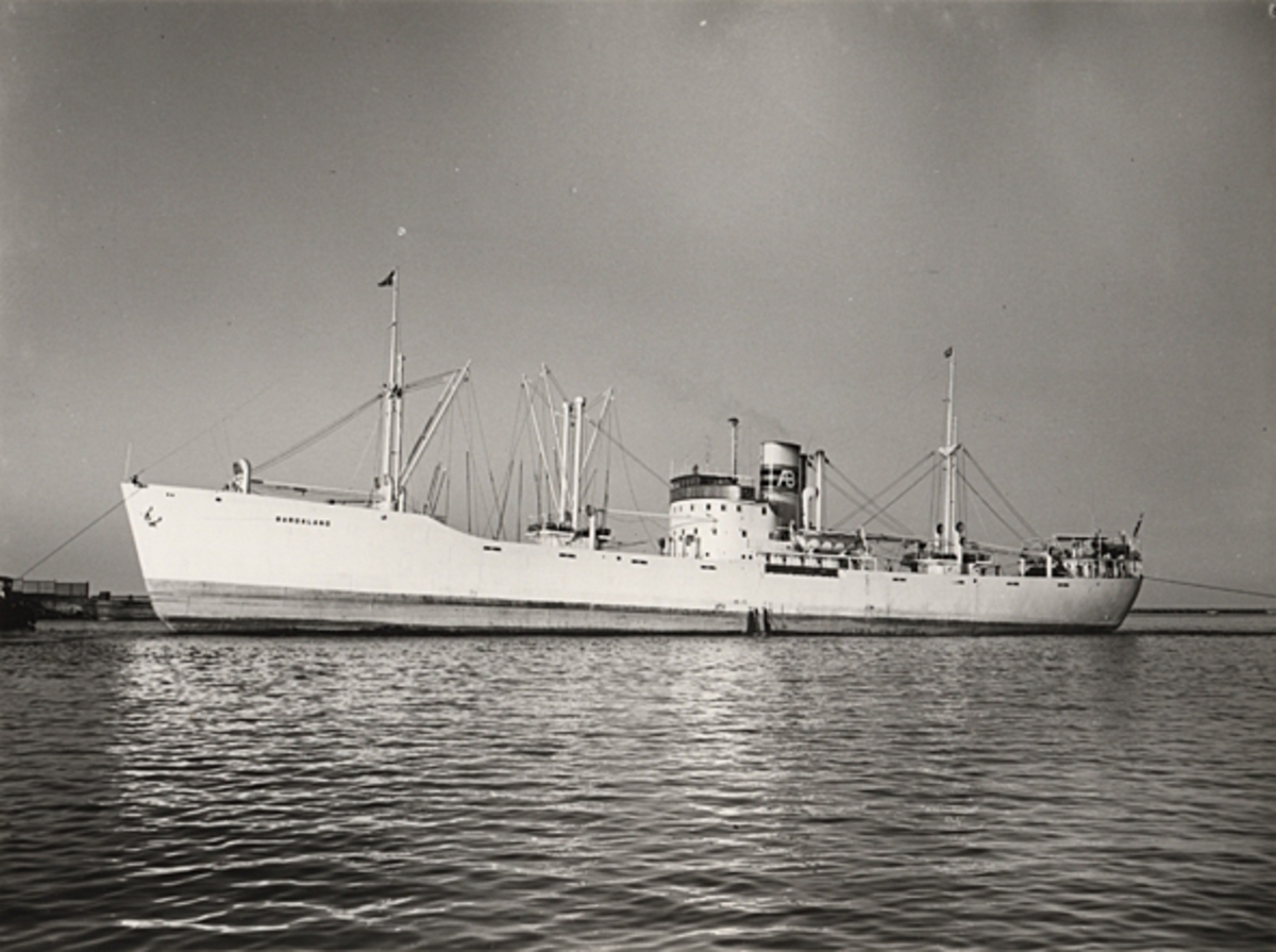 Foto i svartvitt visande lastmotorfartyget "BARDALAND", taget i Köpenhamn den 22.5.1956.