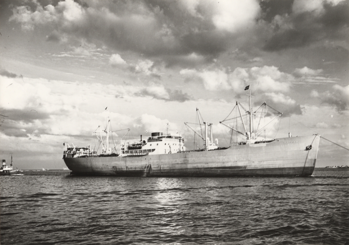 Foto i svartvitt visande lastmotorfartyget "INNAREN" taget i Köpenhamn under år 1955.