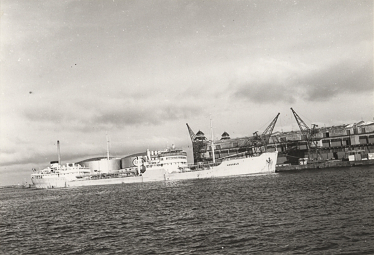 Foto i svartvitt visande malmtankmotorfartyget "HASSELÖ"i Köpenhamn.