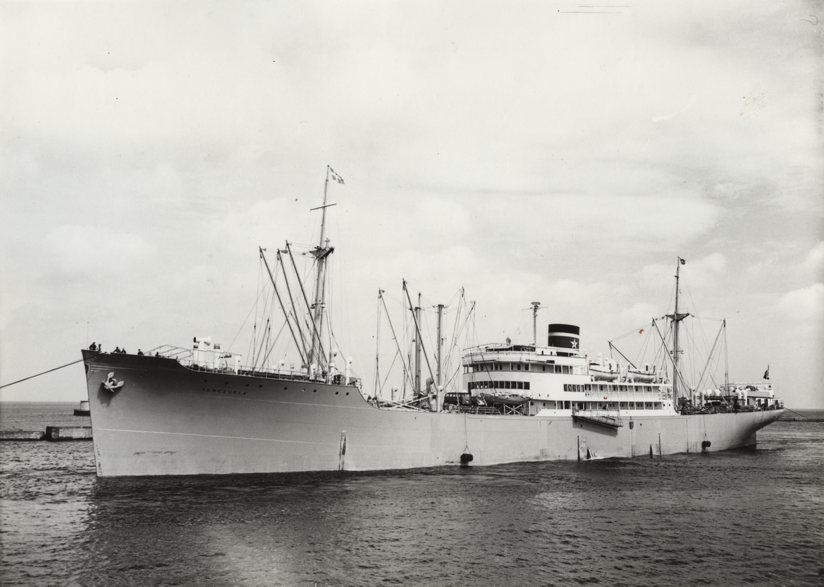 Titel: Foto i svartvitt visande lastmotorfartyget "VENEZUELA" i Köpenhamn under 1950-talet.