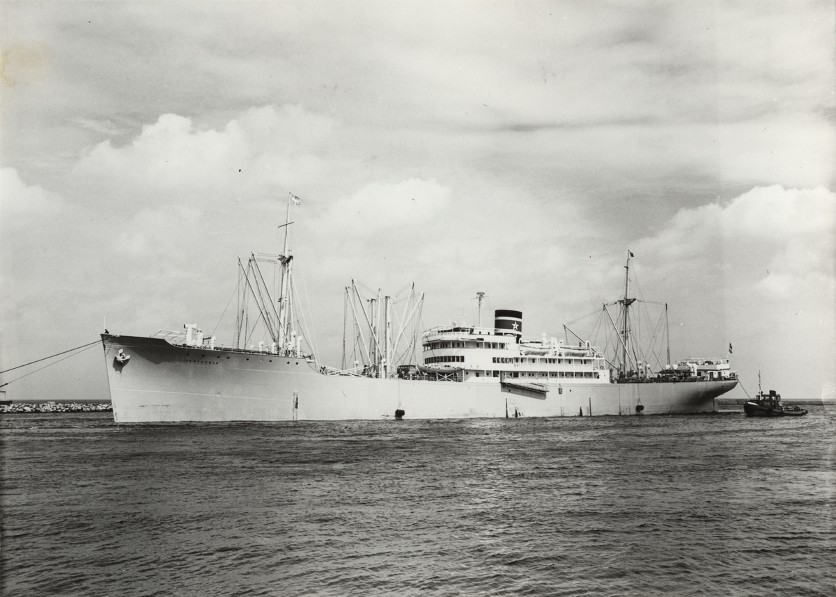 Foto i svartvitt visande lastmotorfartyget "VENEZUELA" i Köpenhamn under 1950-talet.