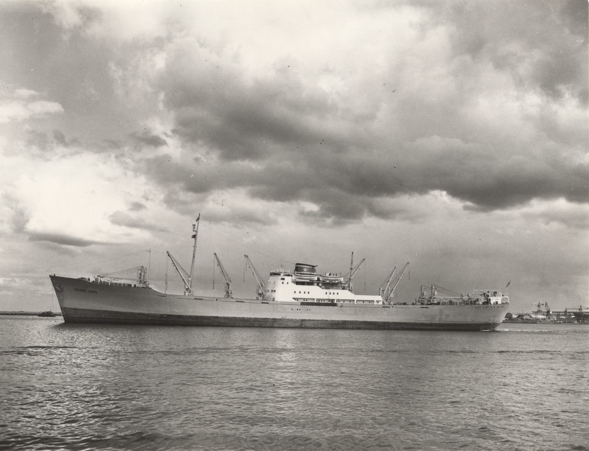 Foto i svartvitt visande lastmotorfartyget "SILVER GATE" i Köpenhamn under år 1954.