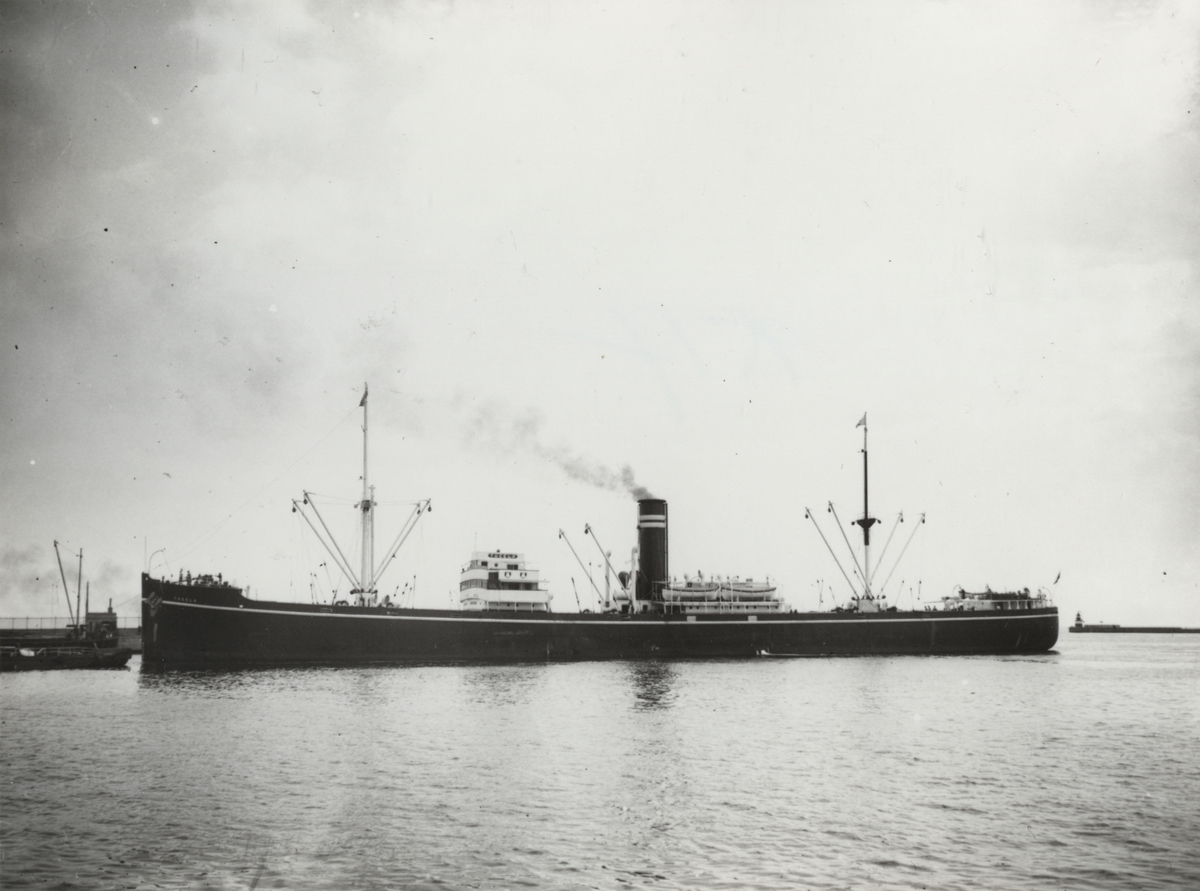 Foto i svartvitt visande lastångfartyget "TUGELA" i Köpenhamn under 1940-talet.