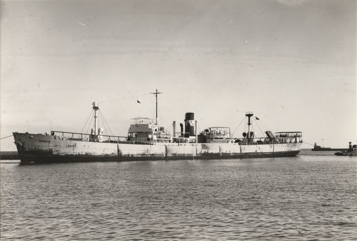 Foto i svartvitt visande lastångfartyget "RANELLA" i Köpenhamn någon gång under åren 1946-55.