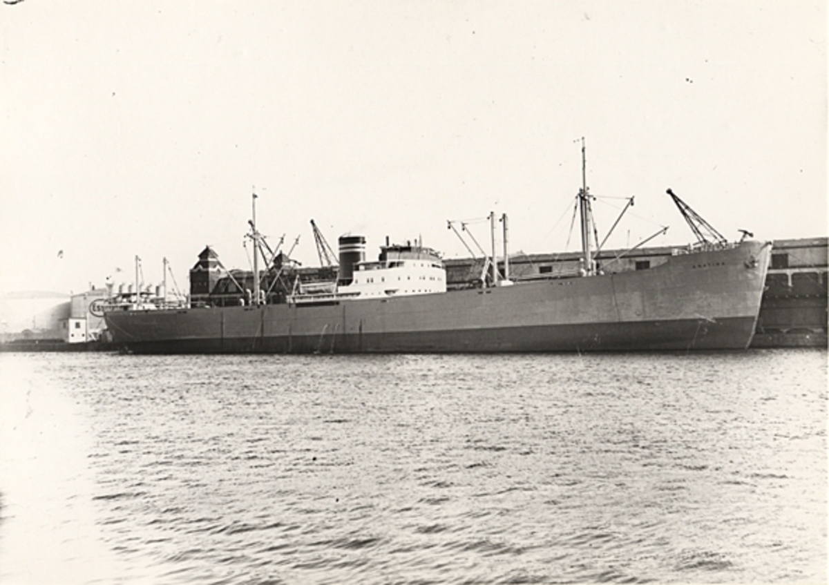 Foto i svartvitt visande lastmotorfartyget "ANATINA" av Kristiansand vid kaj i Köpenhamn.