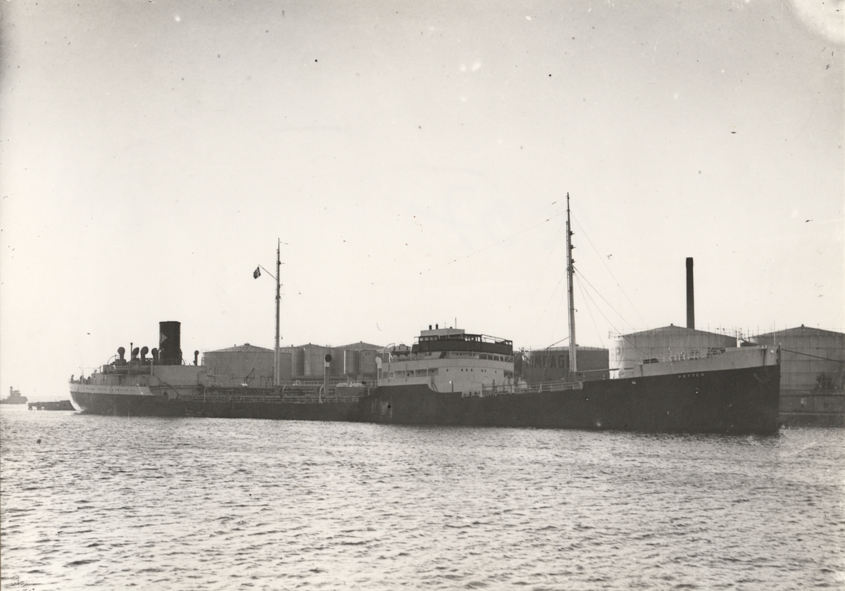 Foto i svartvitt visande tankmotorfartyget "PETTER" i Köpenhamn, mars månad 1954.