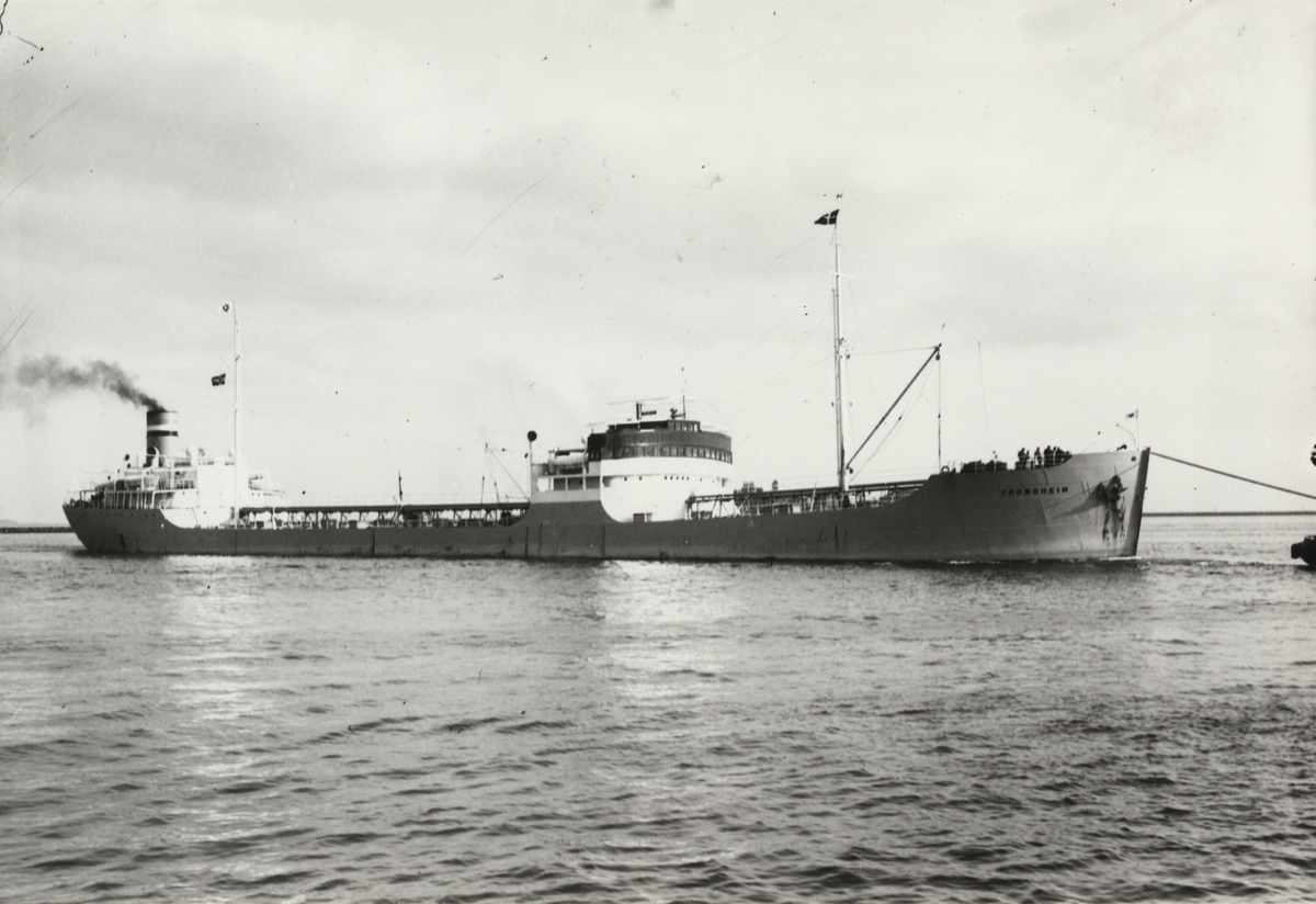 Foto i svartvitt visande tankmotorfartyget "TRONDHEIM" i Köpenhamn i början av 1950-talet.