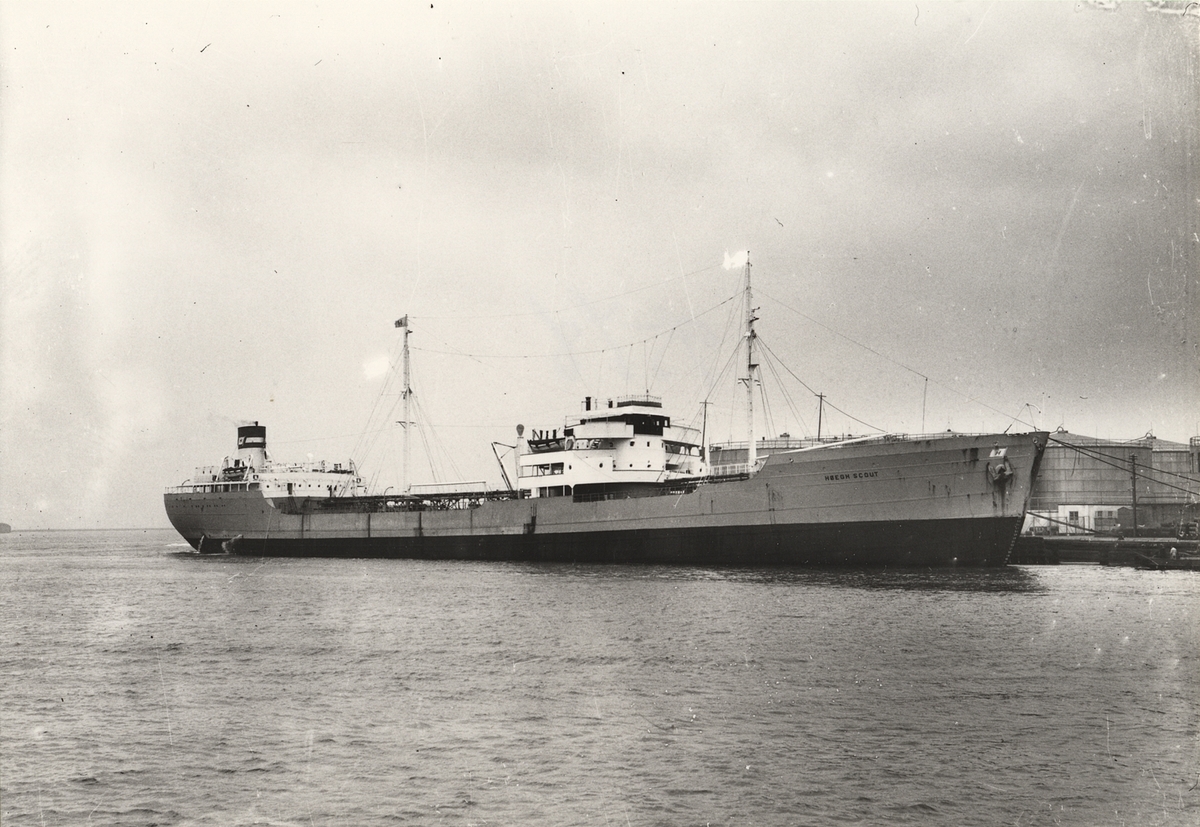 Foto i svartvitt visande tankmotorfartyget "HÖEGH SCOUT" i Köpenhamn, troligen under de första åren av 1950-talet.