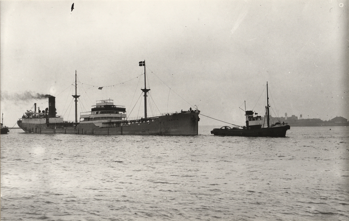 Foto i svartvitt visande tankmotrfartyget "JASPIS" i Köpenhamn.