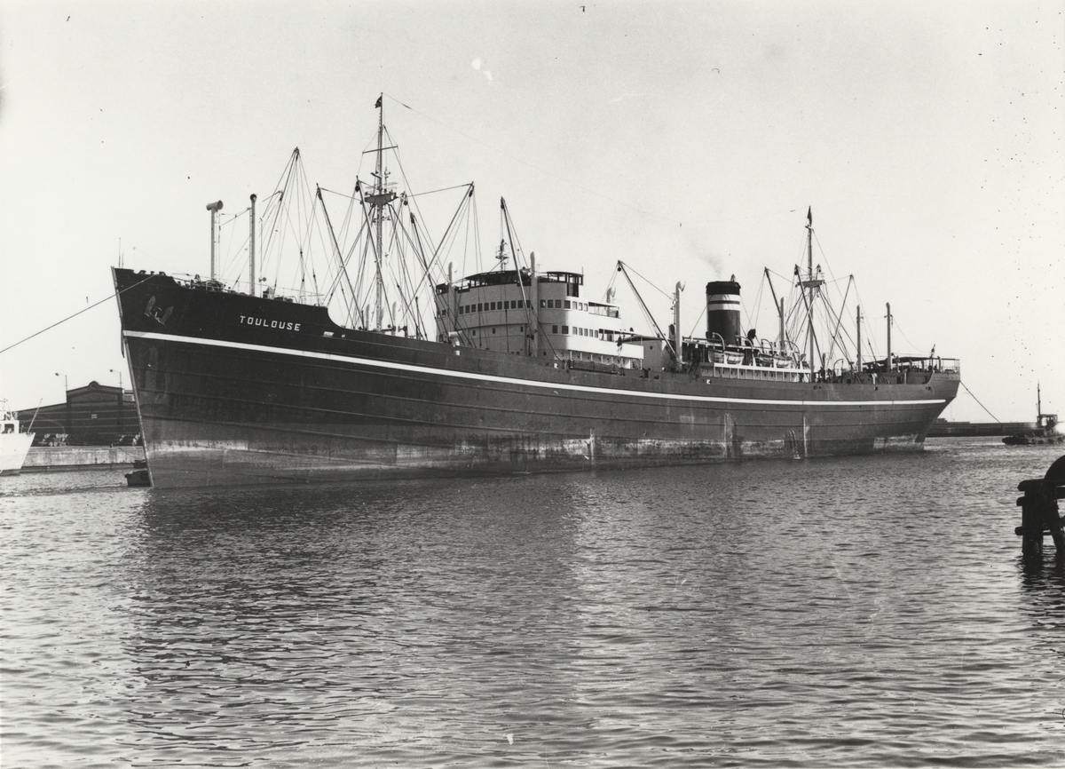 Foto i svartvitt visande lastmotorfartyget "TOULOUSE" i Köpenhamn.