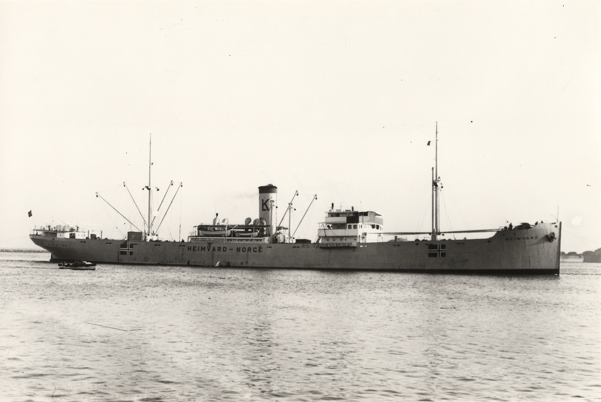 Foto i svartvitt visande lastmotorfartyget "HEIMVARD" i Köpenhamn under 1940-talet.