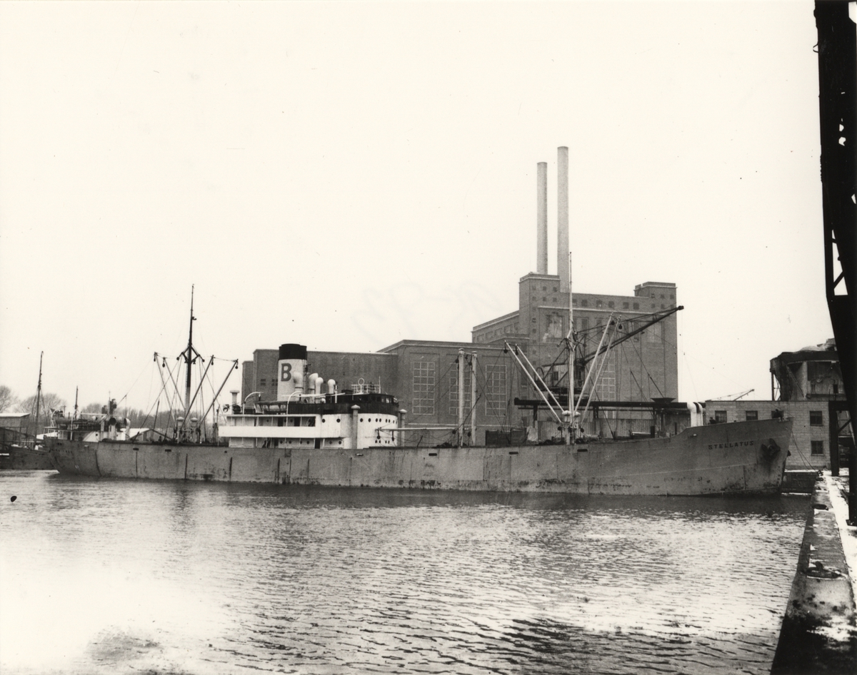 Foto i svartvitt visande lastångfartyget "STELLATUS" i Köpenhamn under 1950-talet.