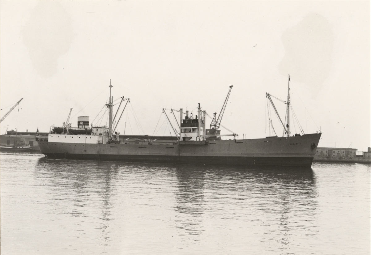 Foto i svartvitt visande lastmotorfartyget "SUNNANVIK" i Köpenhamn under 1950-talet.