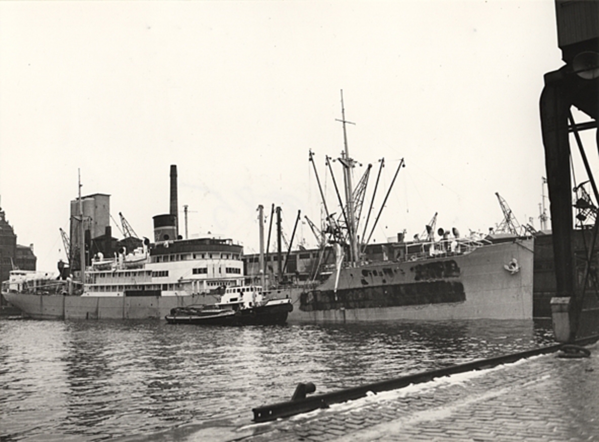 Foto i svartvitt visande lastmotorfartyget "CHILE" i Köpenhamn under 1950-talet. Då fotot togs hade det varit brand ombord på fartyget.
