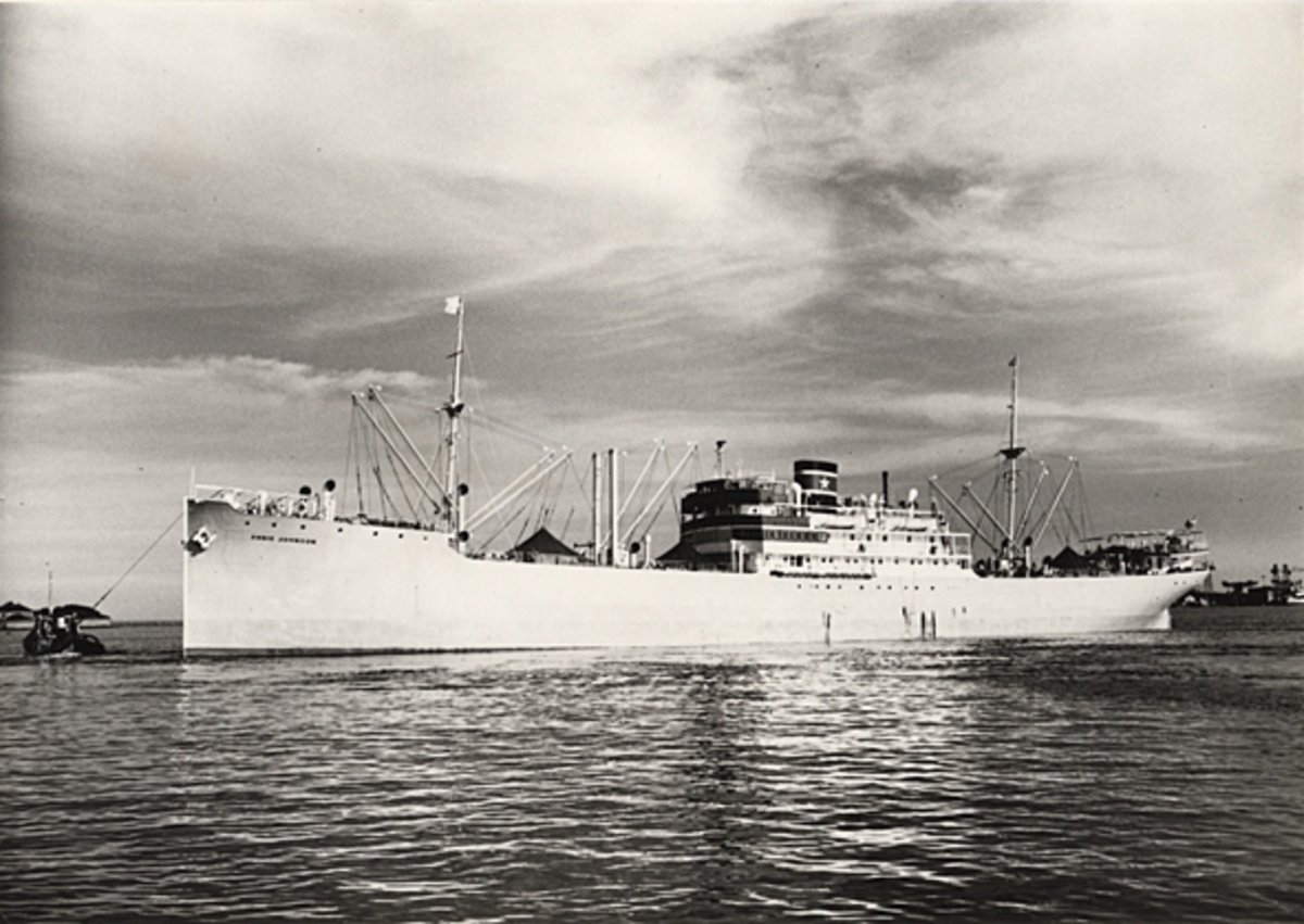 Foto i svartvitt visande lastmotorfartyget "ANNIE JOHNSON" i Köpenhamn.