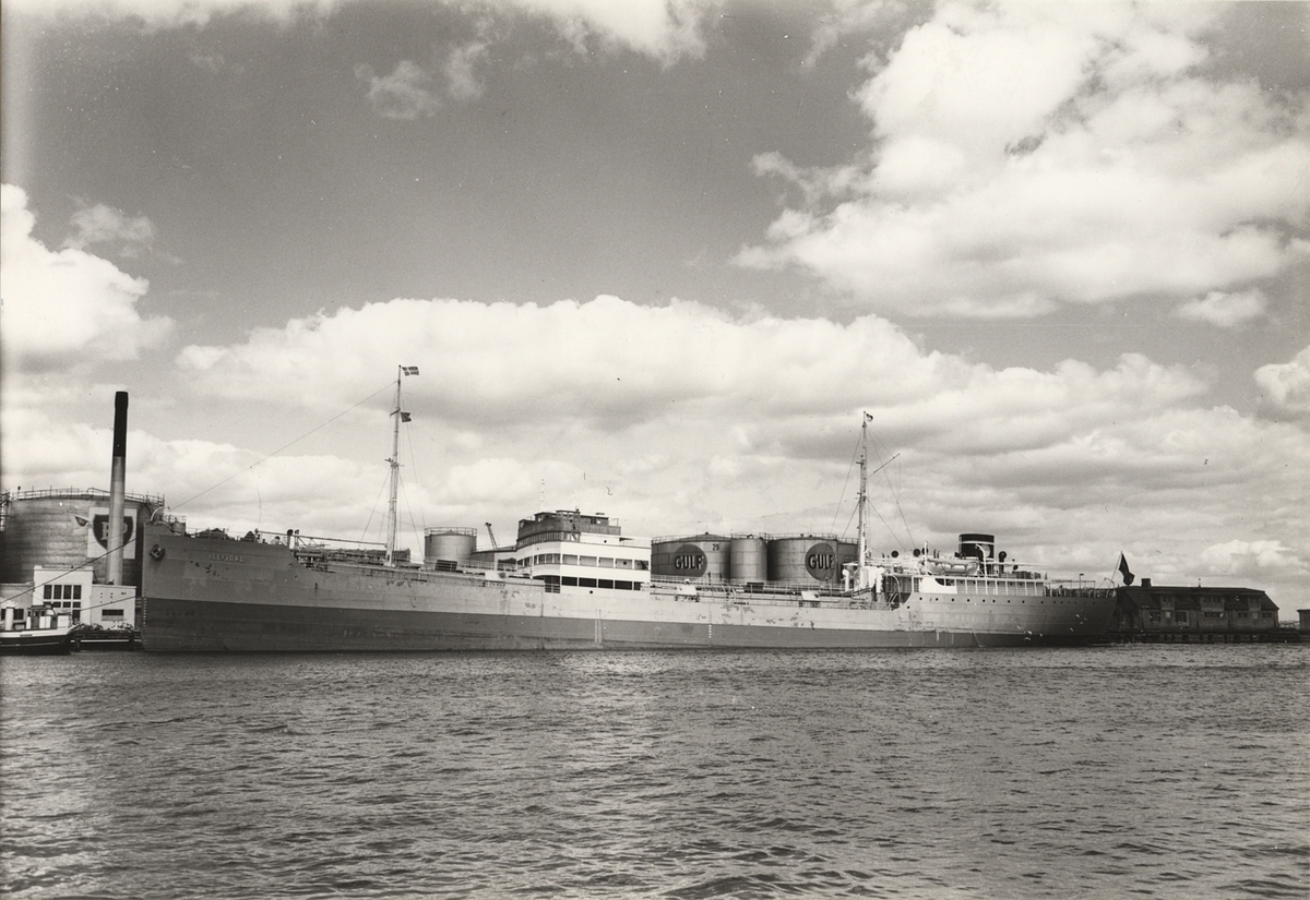 Foto i svartvitt visande tankmotorfartyget "ISEFJORD" i Köpenhamn i slutet på 1930-talet.