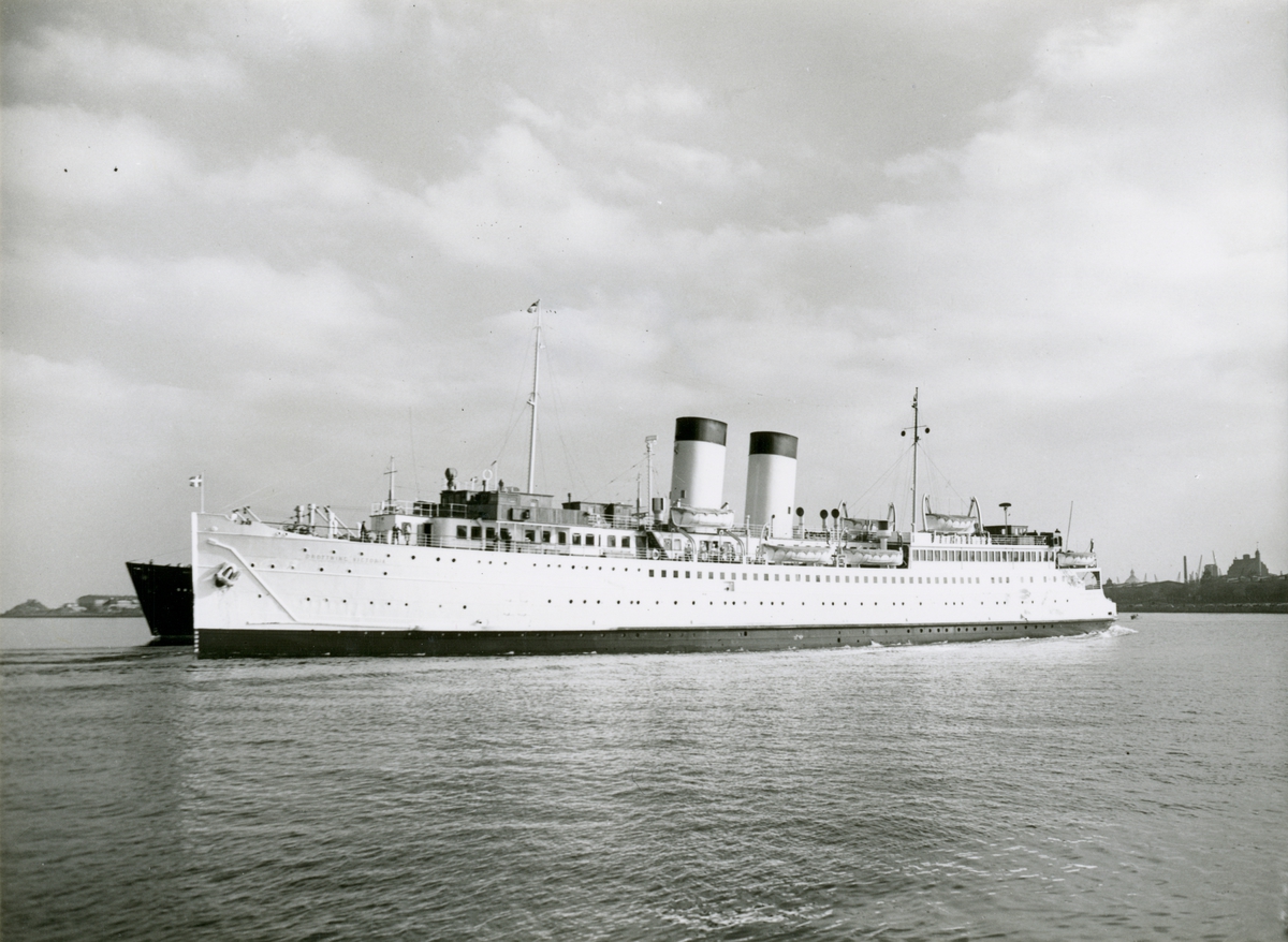 Foto i svartvitt visande tåg-ångfärjan DROTTNING VICTORIA i Köpenhamn.