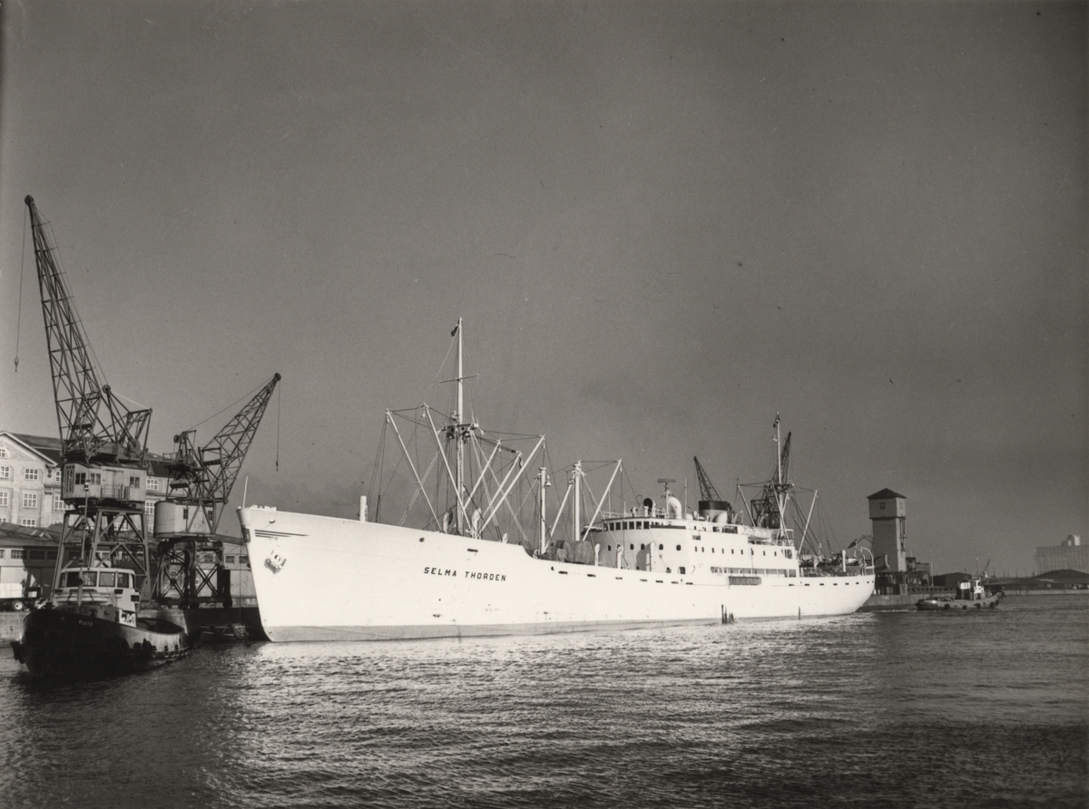 Foto i svartvitt visande lastmotorfartyget "SELMA THORDÉN" i Köpenhamn.