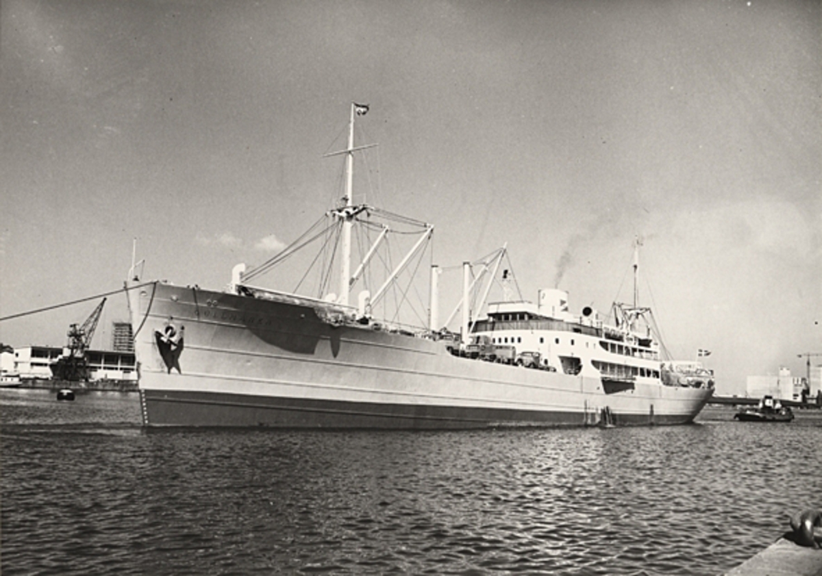 Foto i svartvitt visande lastmotorfartyget "GULLMAREN" i Köpenhamn.