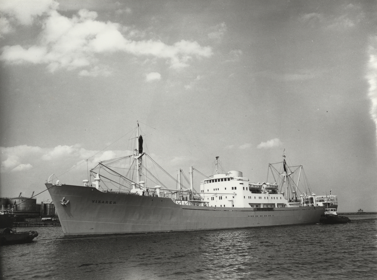 Foto i svartvitt visande lastmotorfartyget "VIKAREN" i Köpenhamn någon gång under åren 1954 - 1962.