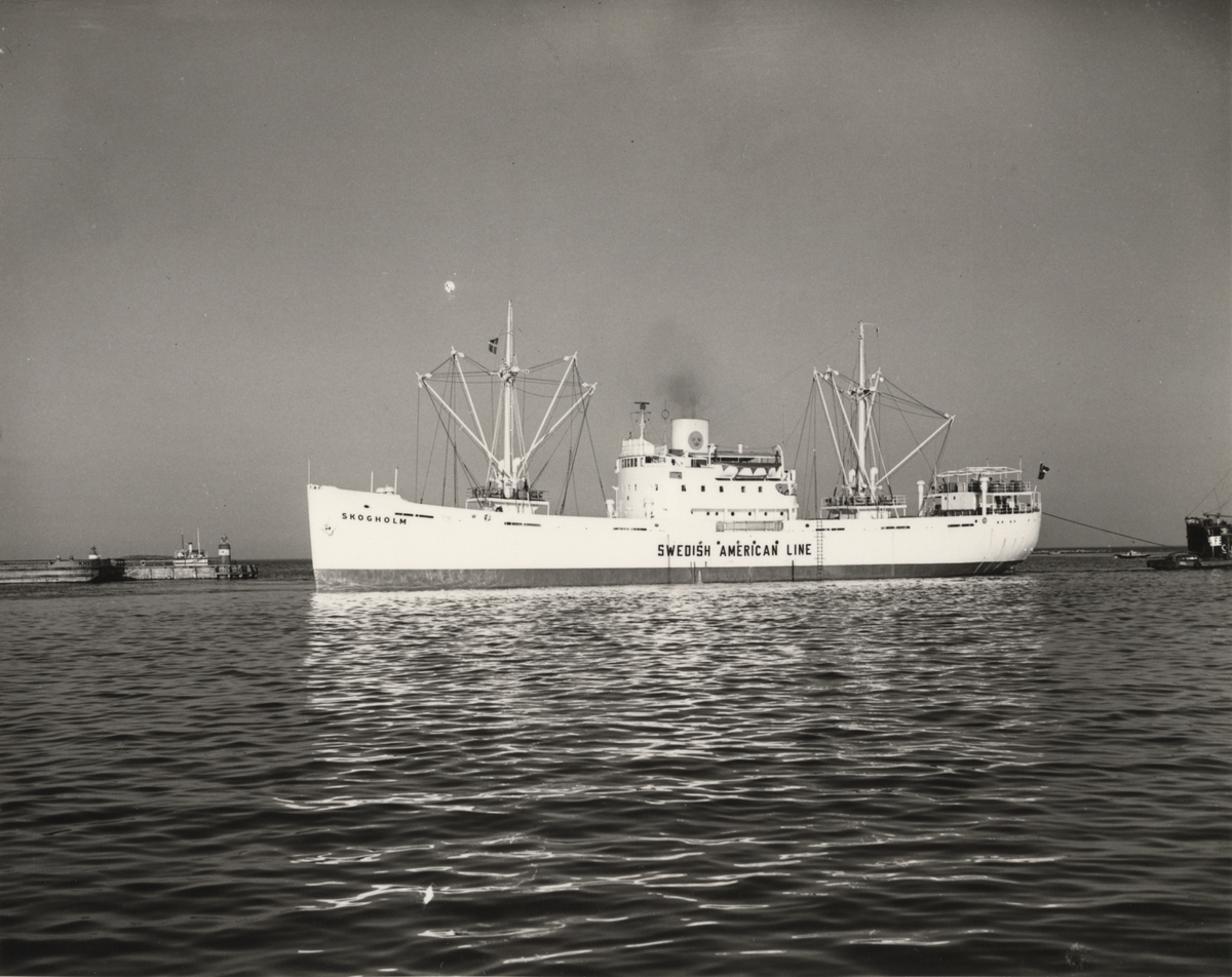 Foto i svartvitt visande lastmotorfartyget "SKOGHOLM" i Köpenhamn någon gång under åren 1955 - 1962.