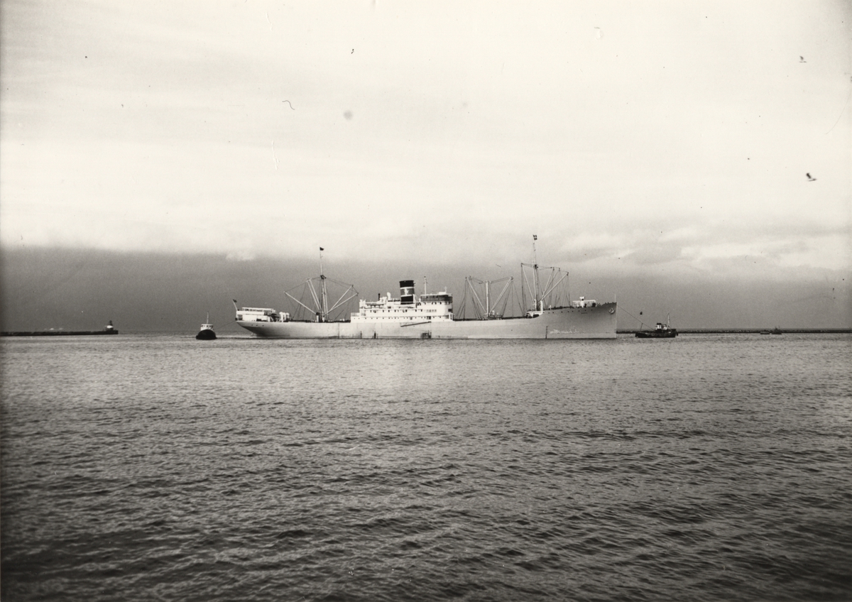 Foto i svartvitt visande lastmotorfartyget "PERU" i Köpenhamn.