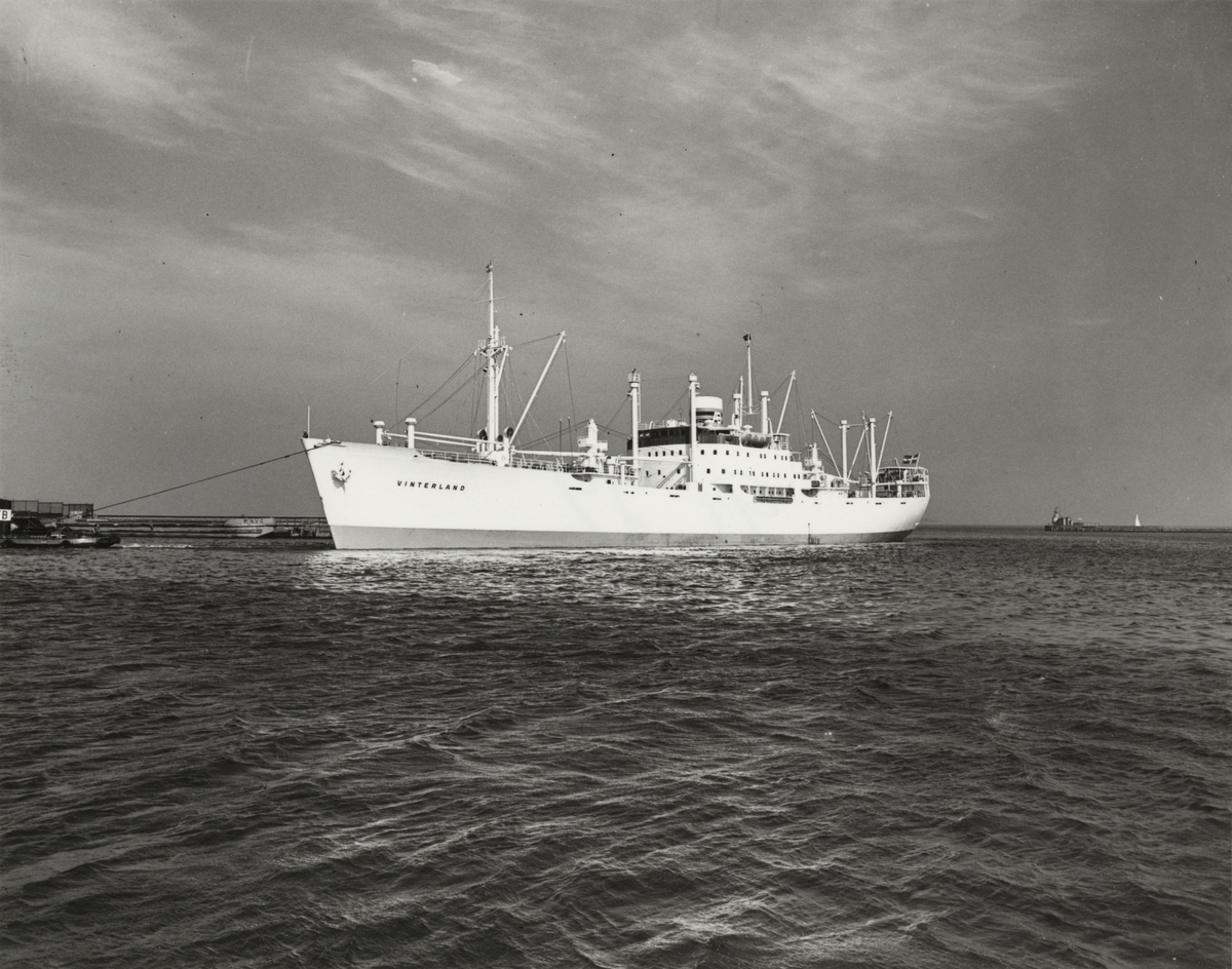 Foto i svartvitt visande lastmotorfartyget "VINTERLAND" i Köpenhamn någon gång under åren 1954 - 1962.