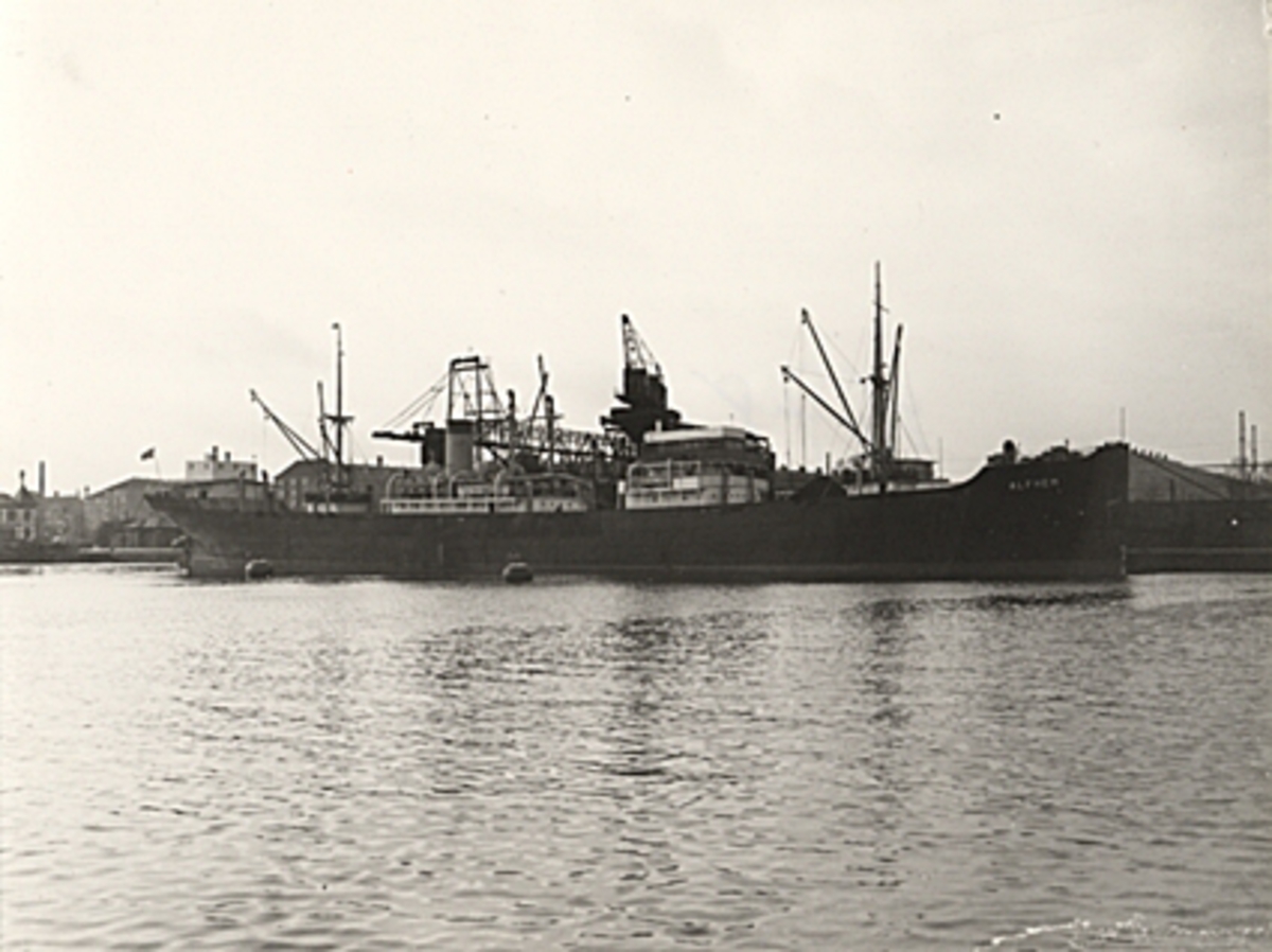 Foto i svartvitt visande lastmotorfartyget "Alfhem" i Köpenhamn någon gång under åren 1953-62.