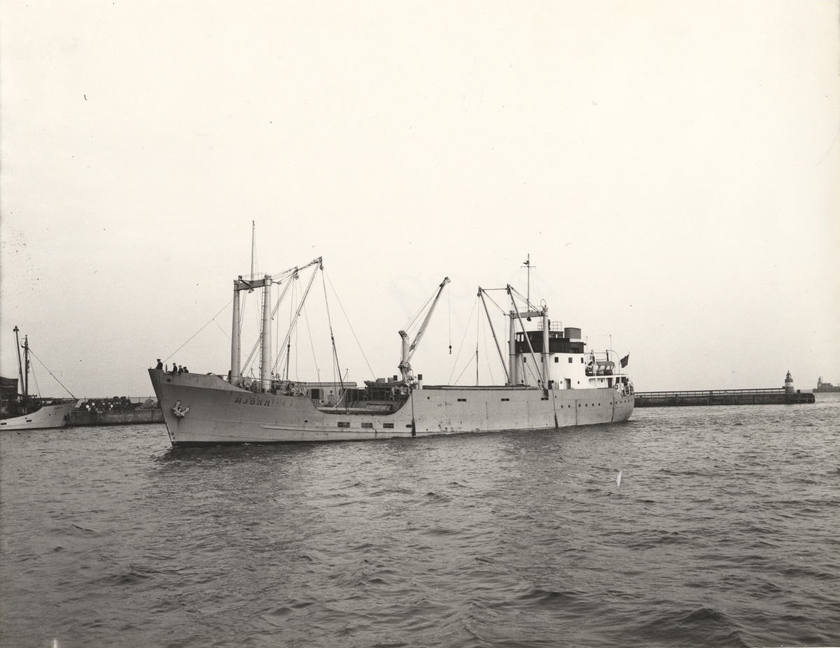 Foto i svartvitt visande lastmotorfartyget "MJÖRN" i Köpenhamn den 5.11.1954.