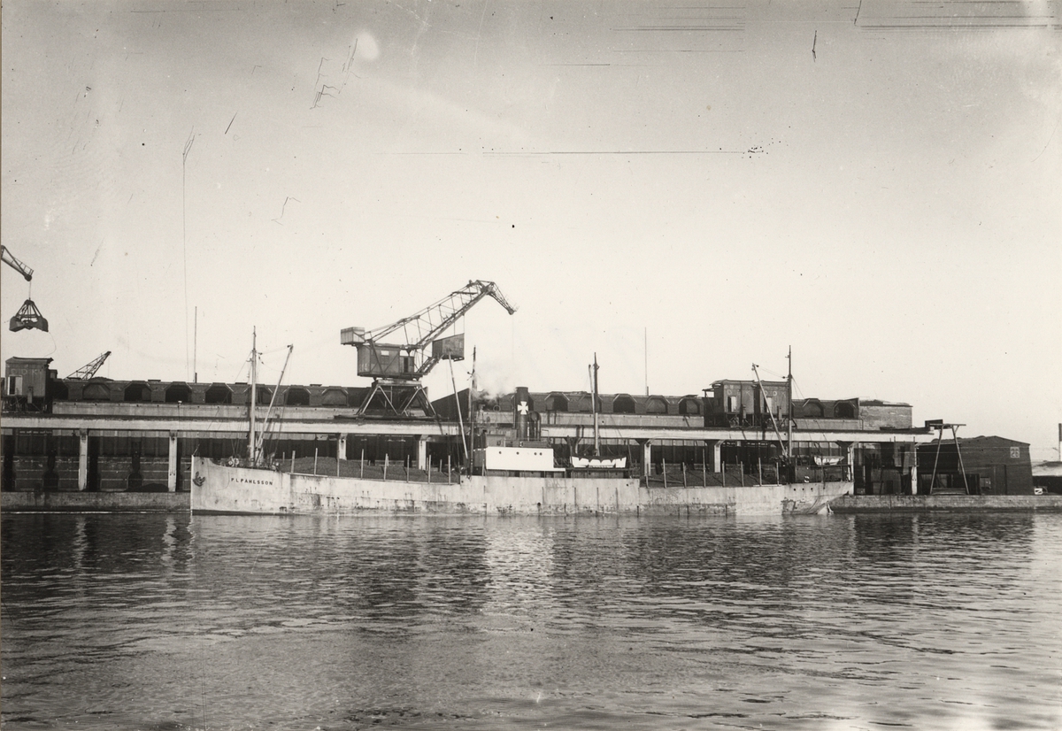 Foto i svartvitt visande lastångfartyget "P.L.PÅHLSSON" i Köpenhamn, troligen under 1940-talet.