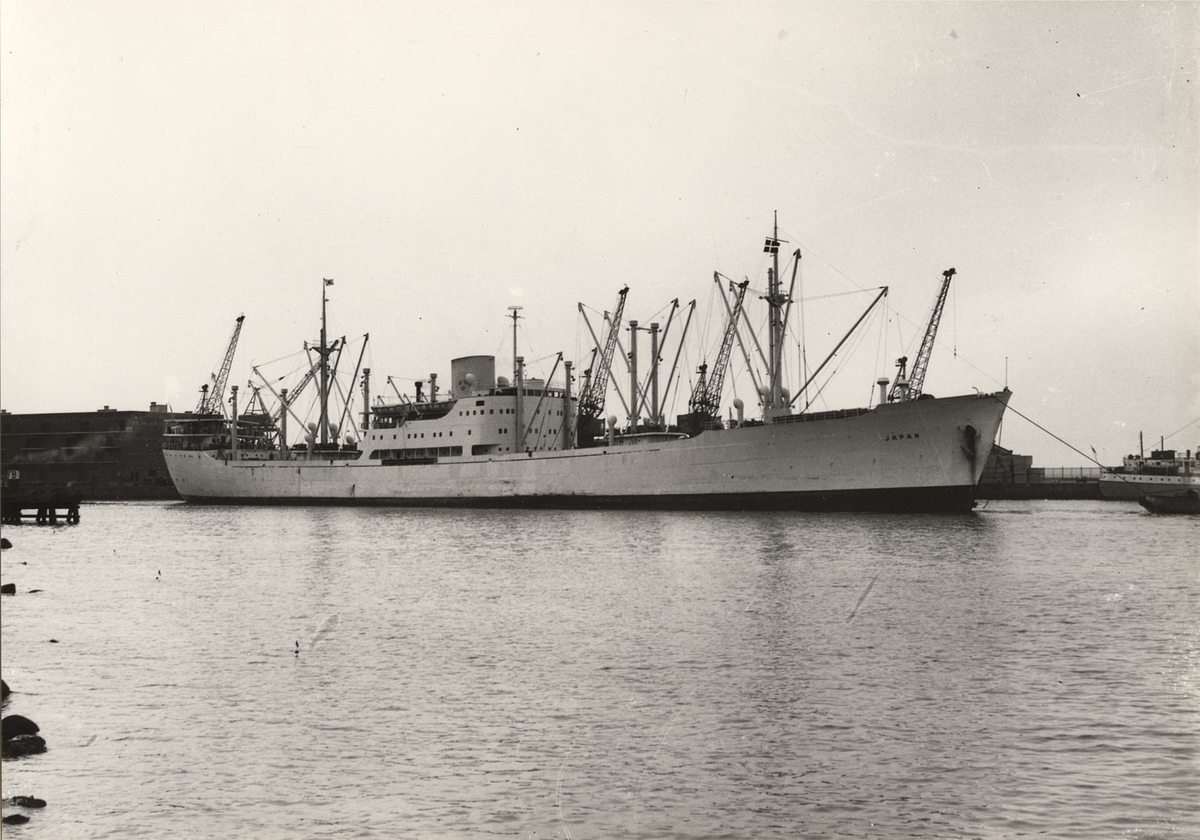 Foto i svartvitt visande lastmotorfartyget "JAPAN" i Köpenhamn under 1950-talet.