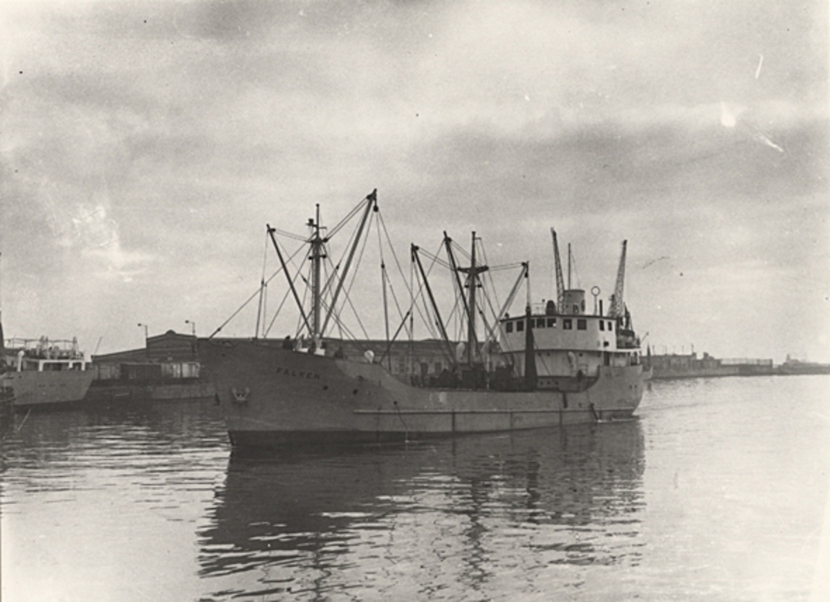 Foto i svartvitt visande lastmotorfartyget "FALKEN" i Köpenhamn.