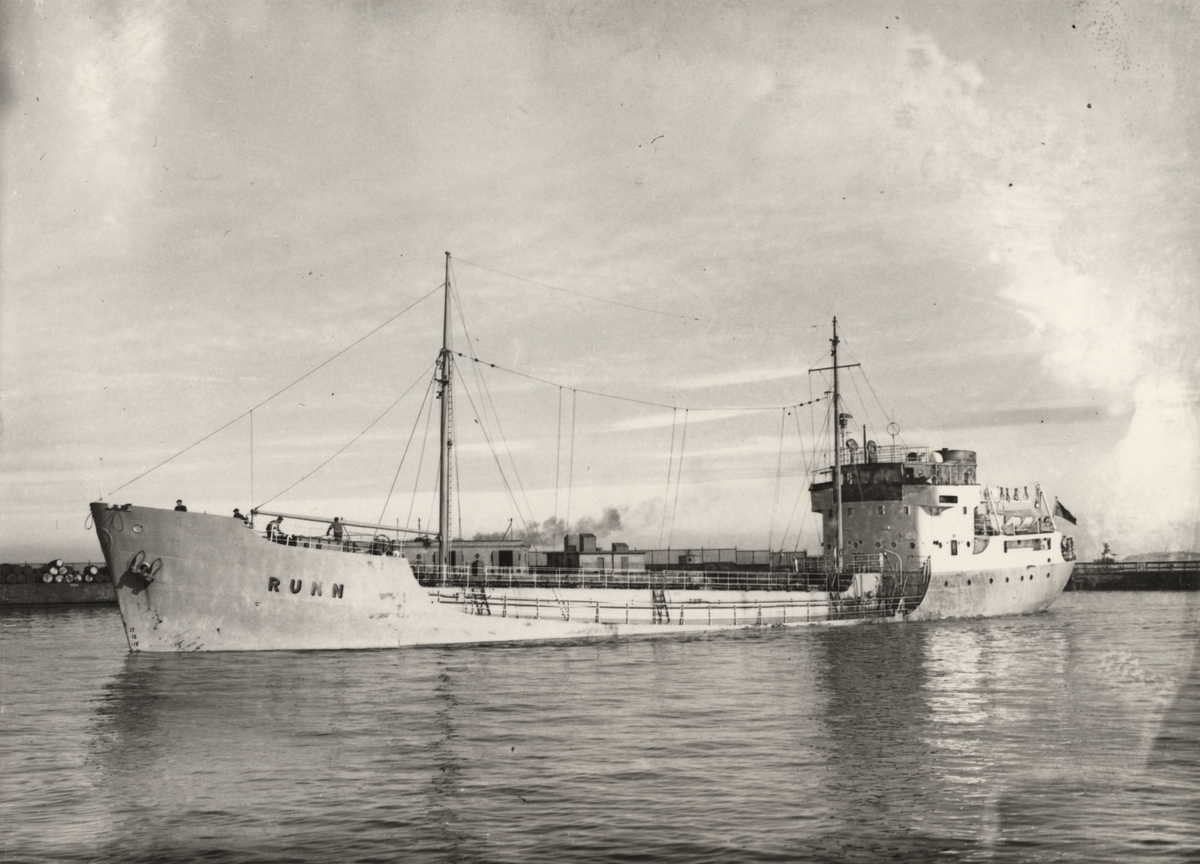 Foto i svartvitt visande tankmotorfartyget "RUNN" i Köpenhamn under år 1952.