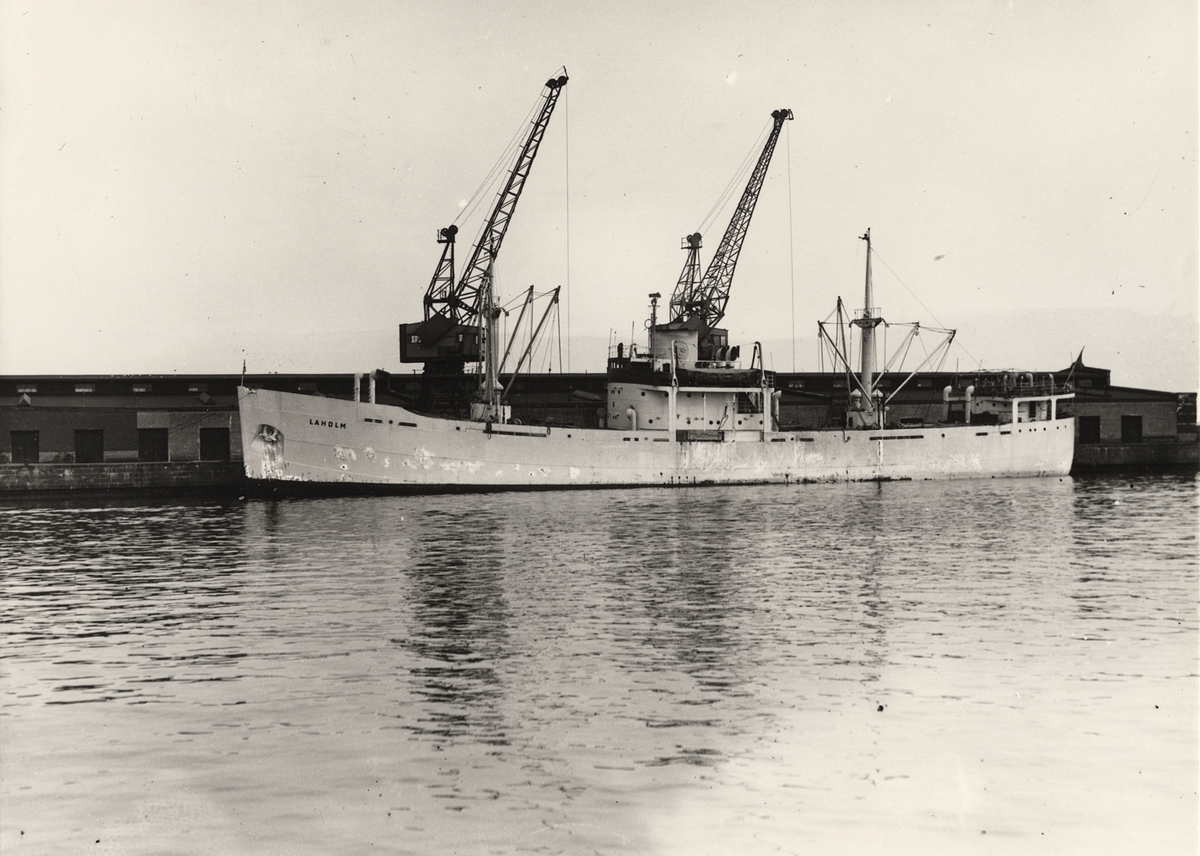 Foto i svartvitt visande lastmotorfartyget "LAHOLM" i Köpenhamn.