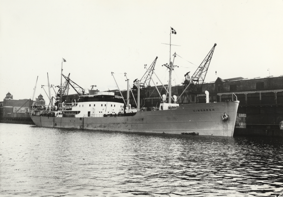 Foto i svartvitt visande lastmotorfartyget "VINGAREN" i Köpenhamn.